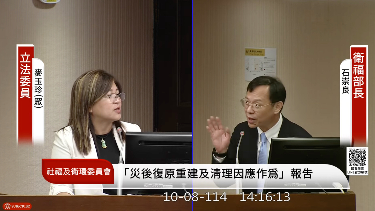 花蓮馬太鞍溪堰塞湖溢流重創光復鄉,民眾黨籍立委麥玉珍今(8)日在立院質詢,呼籲政府加強醫療物資與志工後勤支援。她提到,新住民姊妹志工自駕貨車送餐、甚至募檳榔給卡車司機提神,讓衛福部長石崇良當場急喊:「檳榔不要!檳榔不要!」此幕掀起網路熱議,衛福部次長林靜儀也提醒,不鼓勵養成「沒有吃檳榔提神會無法工作」文化。
