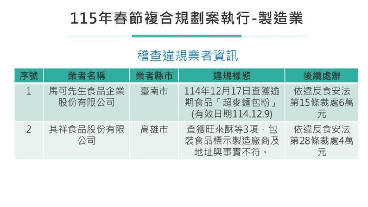 食藥署今(11)日公布「115年春節複合式規劃案」稽查結果,一口氣查獲2件貯存逾期食品,分別為「馬可先生食品企業股份有限公司」台南仁德廠內存放逾期8天的「超麥麵包粉」,以及「君達育樂事業股份有限公司」花蓮分公司存放逾期9天的「濃縮橙汁調飲」。儘管兩家業者皆未開封,仍依法各裁處新台幣6萬元。