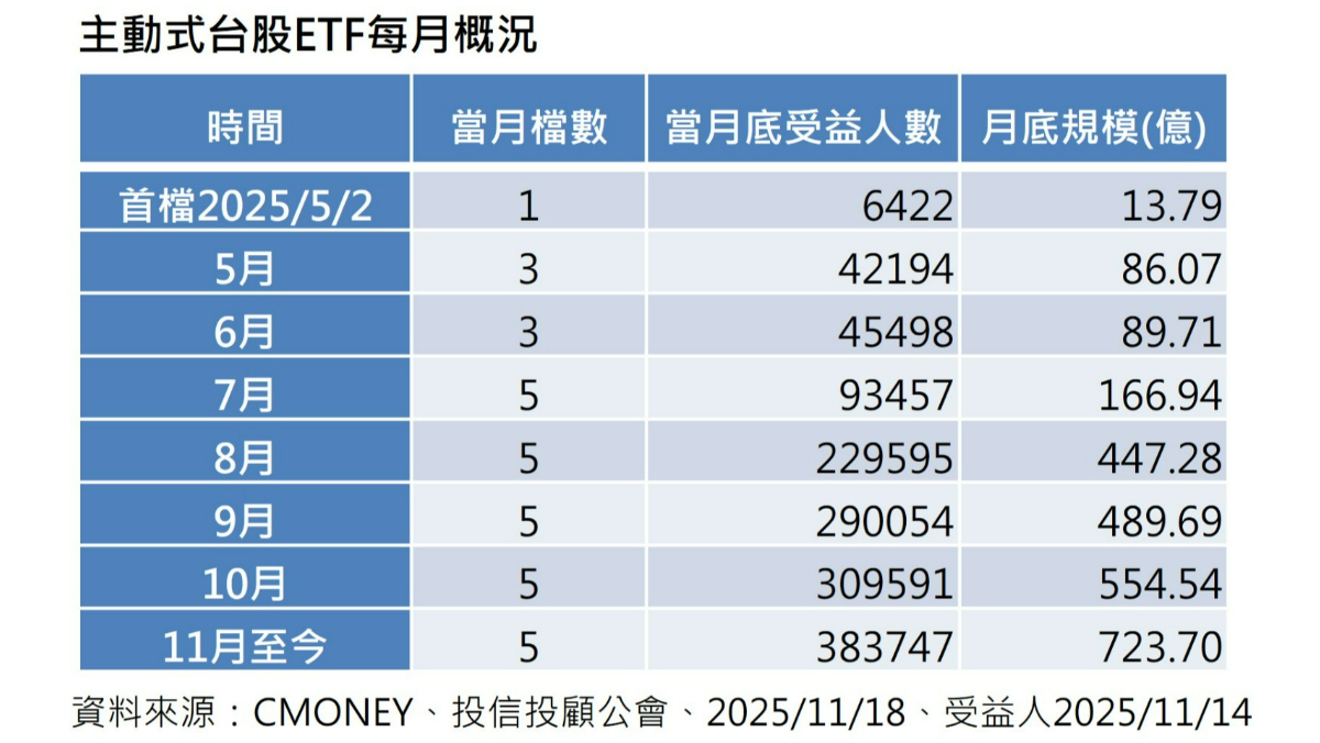 台灣每兩人就有一人投資台股ETF,其中今年5月甫問世的主動式台股ETF更是火熱,統計自5月以來,主動式台股ETF受益人與規模都呈現月月高的趨勢,受益人數從6422人增加到383747人,成長率高達5875.51%,規模從13.79億增加到723.7億,成長率達5148.01%。
