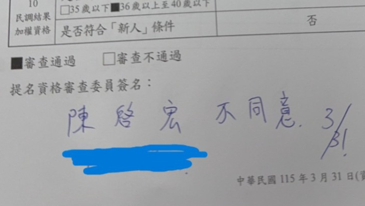 國民黨台北市黨部3月31日市議員提名資格審查小組將黨前副發言人賴苡任參與士林北投區市議員黨內初選資格否決,引發賴不滿,公布資格審查紀錄表,質疑竟因「資格審查委員陳啟宏」1人就否決自己參與黨內初選資格。但因公布圖表中有陳手機,陳今報警提告妨礙名譽與違反個資保護。
