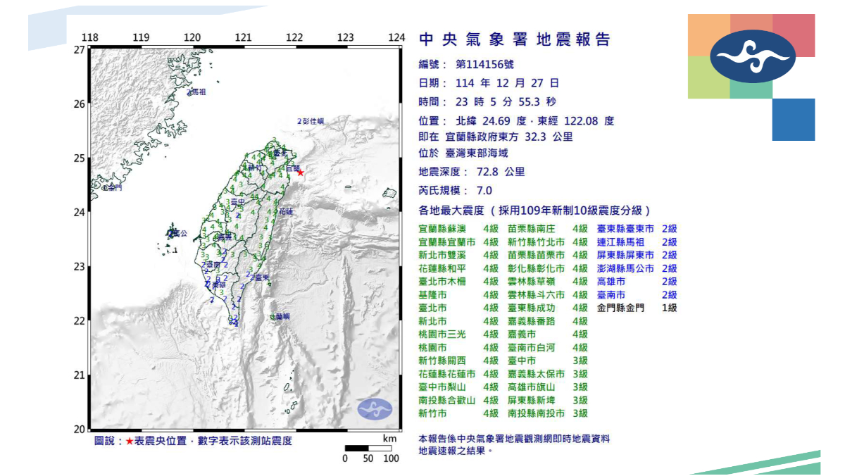 宜蘭外海昨日(12/27)深夜11點5分發生規模7.0大地震,地震深度72.8公里、震央位於宜蘭縣政府東方32.3公里,全台多地最大震度達4級。氣象署地震測報中心指出,這起地震和8月27日宜蘭外海規模6.1地震成因相似,也是繼民國88年921大地震和去年0403大地震後,第三起規模達7級的地震。