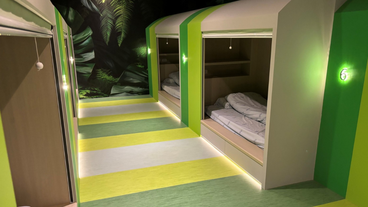 這個空間設計有三大特色,包括:獨立膠囊空間,隔音又遮光,一秒進入深度睡眠;綠意盎然的設計,舒緩緊繃的神經;下工作崗位後確保休憩品質、上工時精神飽滿繼續守護旅客安全。