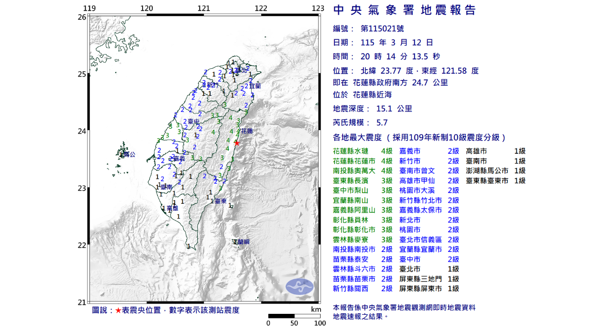 地震晚間再度發生!中央氣象署指出,今(3/12)20:14左右,花蓮地區附近發生規模5.7有感地震,震央位於北緯 23.77度、東經 121.58度,花蓮縣政府南方24.7 公里處的花蓮縣近海,深度僅15.1公里,屬於淺層地震。