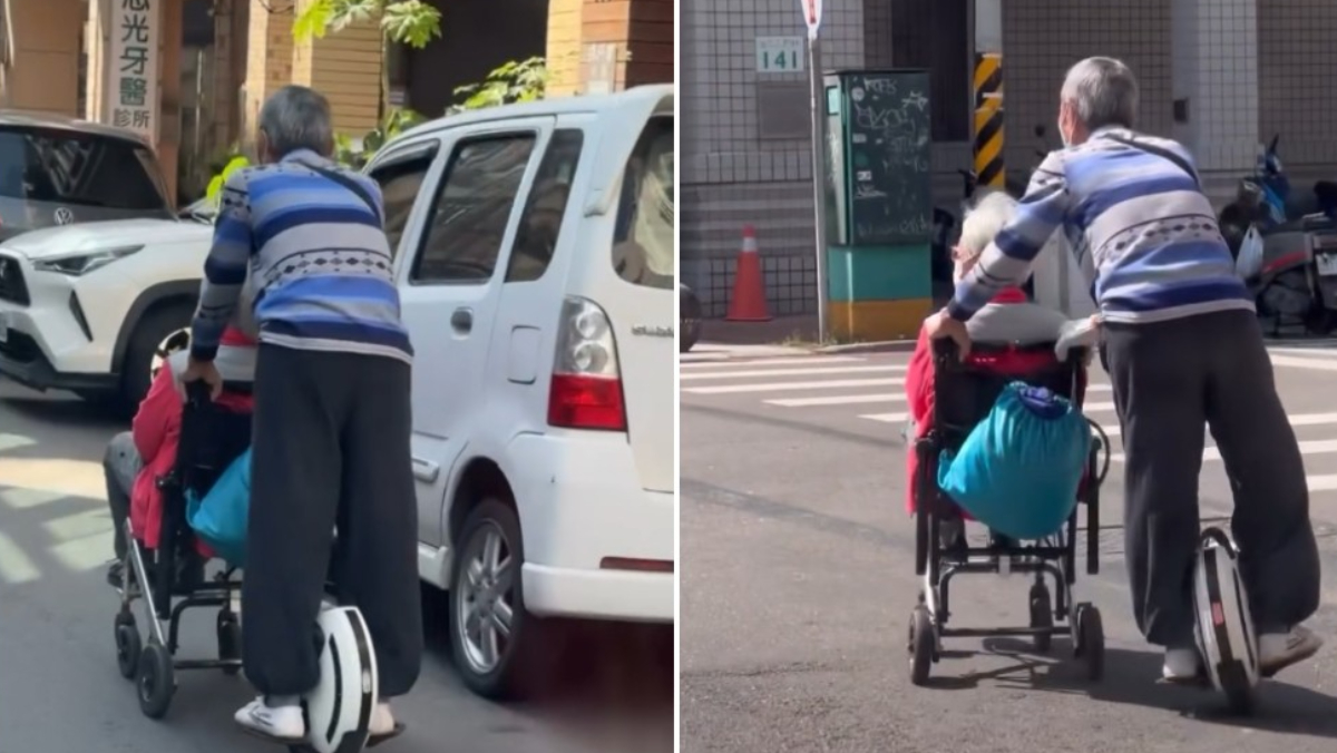 真的太危險!高雄出現一位阿北,竟在馬路的車陣中,腳踩電動獨輪車,甚至前方推著一張輪椅,輪椅上甚至有1名白髮婦人,速度甚至堪比機車,在車陣中穿梭,轉彎時甚至驚險甩尾。有網友拍下影片,上傳社群平台後,警方表示該行為已違規,最高可處3600元以下罰鍰。