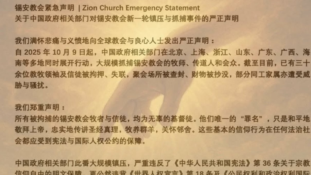 中國錫安教會面臨大規模抓捕,自9日起已有約30名牧者和教友被警方帶走。對華援助協會創辦人兼會長傅希秋說,這是1980年代以來,中國對城市獨立家庭教會最廣泛、最系統、最嚴厲的一波鎮壓。