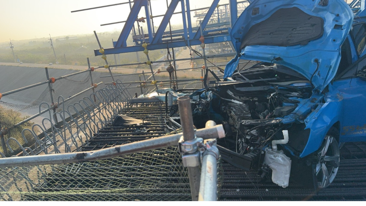 台南市台江大橋23日開工日發生驚悚死亡車禍,1輛藍色奧迪不明原因猛烈撞擊,引擎與車身解體,30歲王姓男駕駛當場死在駕駛座,轄區市警三分局調查肇事原因。