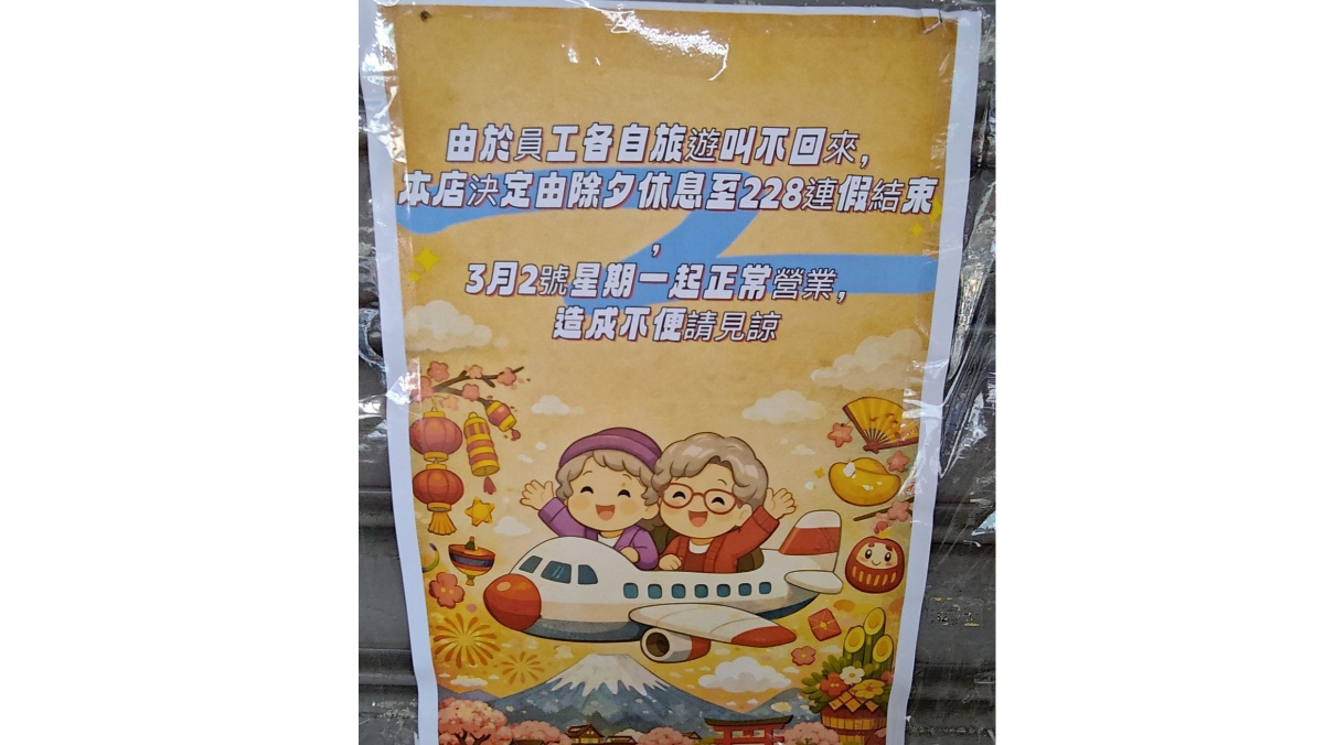 今年春節連假9天結束,上班日4天完後接著是228連假3天,有民眾在網路社團分享,某店家公告,因為員工都出去旅遊「叫不回來」,所以全店從除夕休息至228連假結束,讓原po直呼「幸福企業」,網友也留言「這麼棒的福利」,貼文也意外釣出店長本人留言。