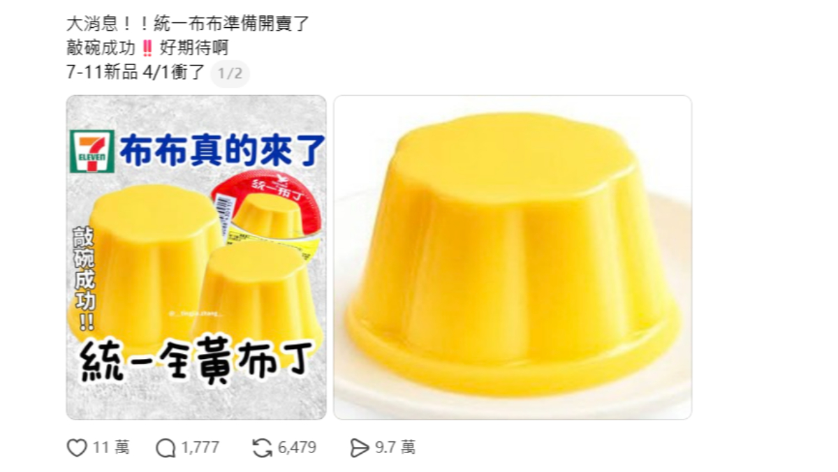 統一布丁真的很皮!有Threads網友昨(21日)昨天透露,繼去年推出「翻轉布丁」後,統一布丁將在愚人節4月1日當天推出「全黃布布」,也就是無焦糖丁的版本,令不少人笑爆,敲碗期待!不過,由於開賣時間剛好是愚人節,也有人猜,可能是惡搞。對此,雖然7-ELEVEN求官方還未公開證實,但有自稱是7-11員工留言表示「我是員工,我發誓有這個活動」。