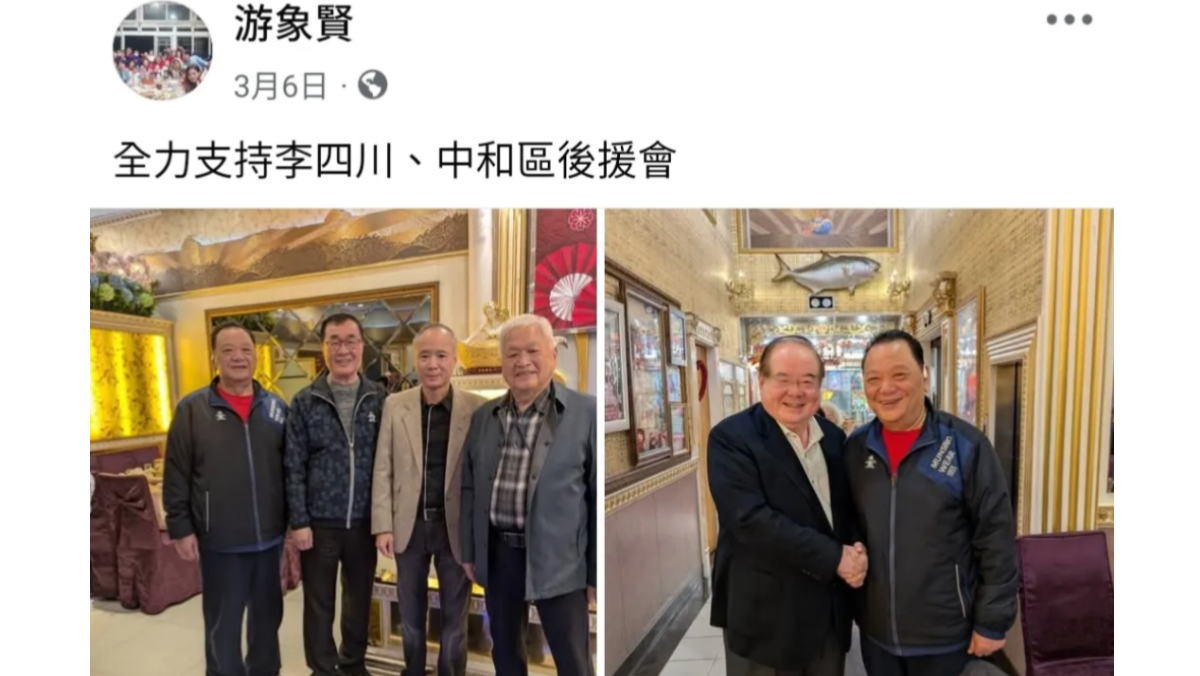 國民黨新北市長候選人李四川才剛投入選戰就面臨形象瓦解危機,除了先前被爆料胞弟李賜福是小琉球環保流氓,昨日又被批評,其中和區後援會的成員,竟有天道盟副會長游象賢,游還大辣辣在網路上公開合照,讓已經被民進黨候選人蘇巧慧超車的民調,可能又面臨搖搖欲墜的窘境。