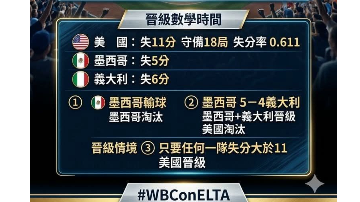 WBC(World Baseball Classic,世界棒球經典賽)B組賽程將在台灣時間進行義大利與墨西哥之戰,由於美國隊爆冷輸球,使得B組形成3搶2局面,狀況類似C組的台灣、澳洲與南韓搶晉級,可能出現比失分率狀況,由於數學算式難懂,負責轉播的電視台提前製作解答圖卡,幫助球迷快速瞭解戰局變化。