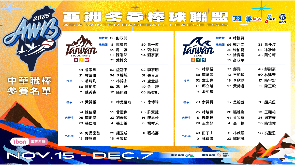 冬日棒球熱潮即將再起!2025亞洲冬季棒球聯盟將於11月15日開打,今年集結台、日、韓共五支球隊進行對戰,包含季後賽在內共44場賽事,將於高雄澄清湖棒球場與嘉義市立棒球場熱血登場。冬季聯盟賽事平日免費入場,例行賽假日場次預購票270元,採自由入座;另推出限定全季套票1380元,可觀看所有場次賽事並享提前入場福利。冬盟售票將於11月3日中午12點於 ibon 售票系統全面開賣,邀請全台球迷一同感受冬季棒球的熱血魅力。