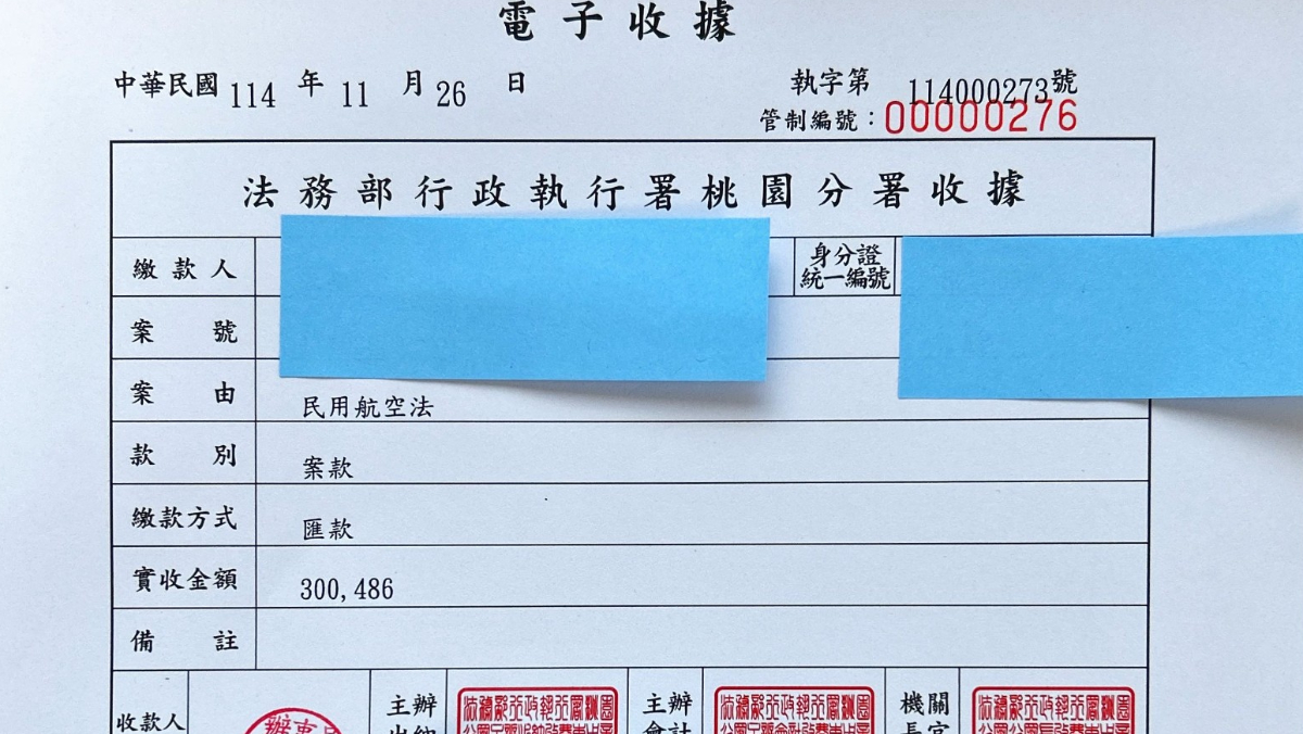 1名江姓女攝影師,在台北市信義區無人機禁航區操作飛行無人機,甚至飛行高度還與台北101大樓高度相當,因此被裁罰30萬元,由於江女拒絕被移送強制執行,桃園分署收案後扣押江女名下股票後,江女才乖乖一次繳清。
