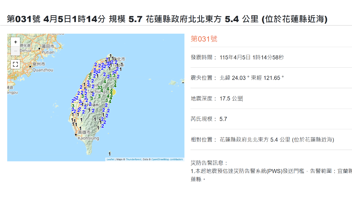 半夜好搖,花蓮近海今(4/5)凌晨1時14分發生芮氏規模5.7地震,最大震度3級,是中央氣象署地震監測中心的今年數據中「今年迄今最大」一次,最大震度為花蓮、宜蘭3級,幾乎全台有感。