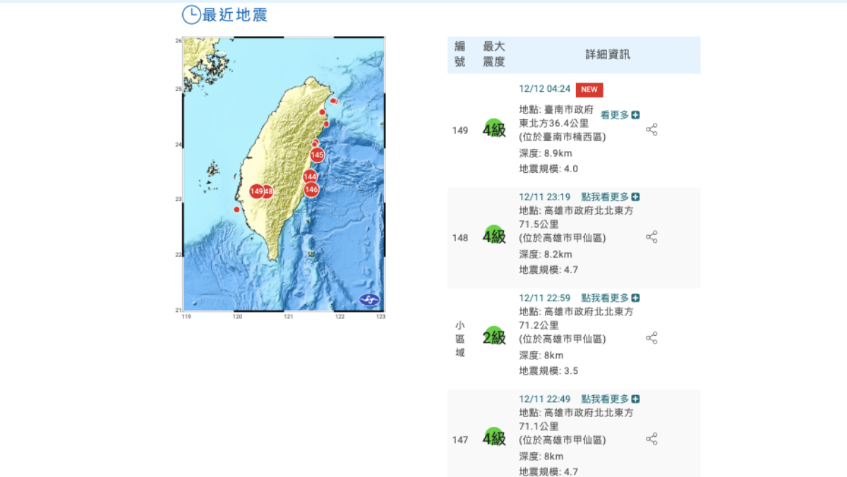 昨天(12/11)晚間高雄市甲仙區連3起有感淺層地震,其中兩起規模4.7,今(12/12)晨4時24分台南市楠西區又發生規模4.0地震。中央氣象署地震測報中心科長邱俊達今上午表示,楠西的地震歸類在1月21日大埔地震的餘震序列裡面。