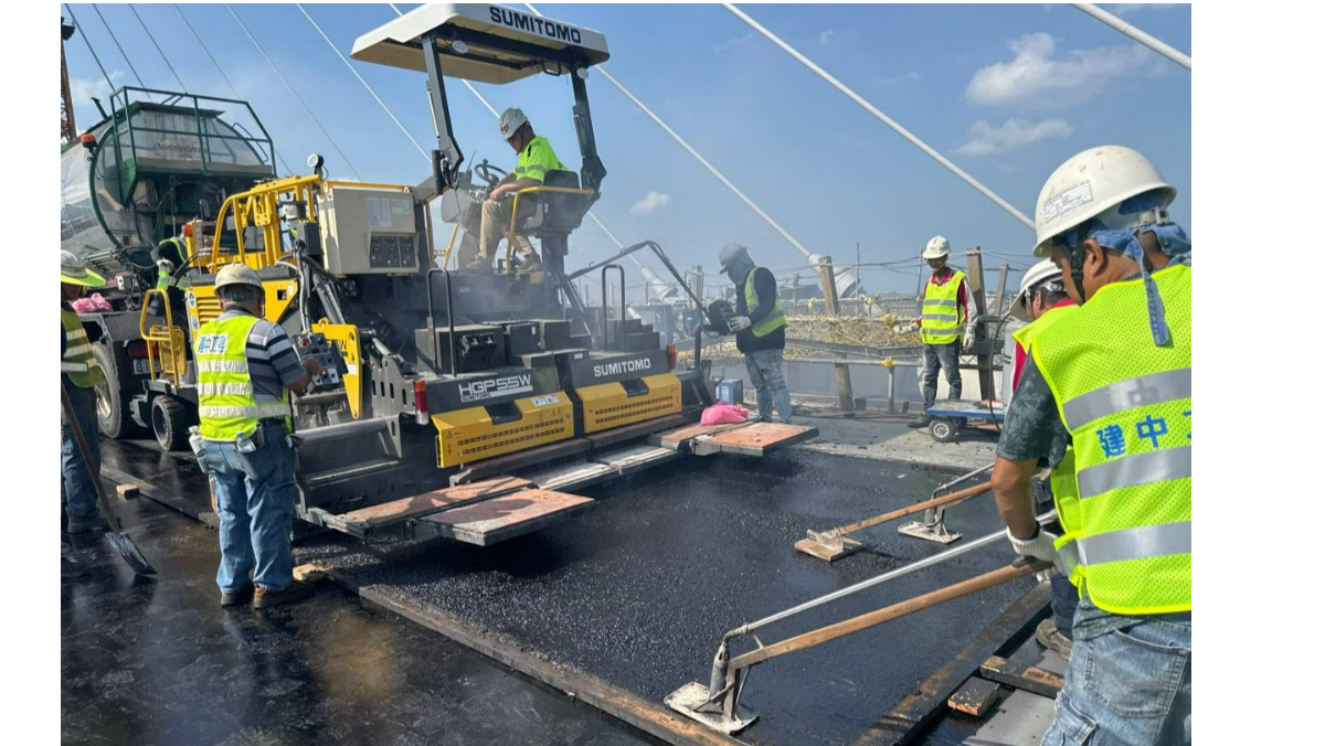 淡江大橋工程進入最後關鍵階段!交通部公路局北區公路新建工程分局於11月16日啟動鋼床板GUSS瀝青混凝土鋪面作業,施作區段為5K+895至6K+539,全長約640公尺。此次鋪面作業預計工期約45天(不含天候因素),將於今(2025)年底完成,並接續辦理護欄、照明、伸縮縫等附屬設施工作,穩健推進直達通車條件。