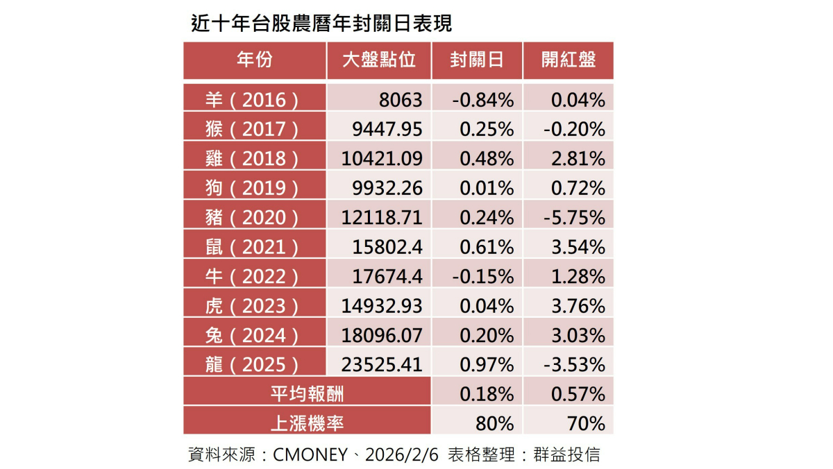 台股蛇年2月11日就要封關,投資人對於是否抱股過年存有疑慮,根據群益投信統計資料顯示,大盤近十年封關日當天上漲機率是80%,平均漲幅0.18%,而年後紅包行情可望延續漲勢。市場法人表示,由於農曆春節年假長達11天,投資人在分散風險的前提下,抱股過年的最佳投資方式就是選擇台股基金或是擁有不錯配息率的台股ETF。