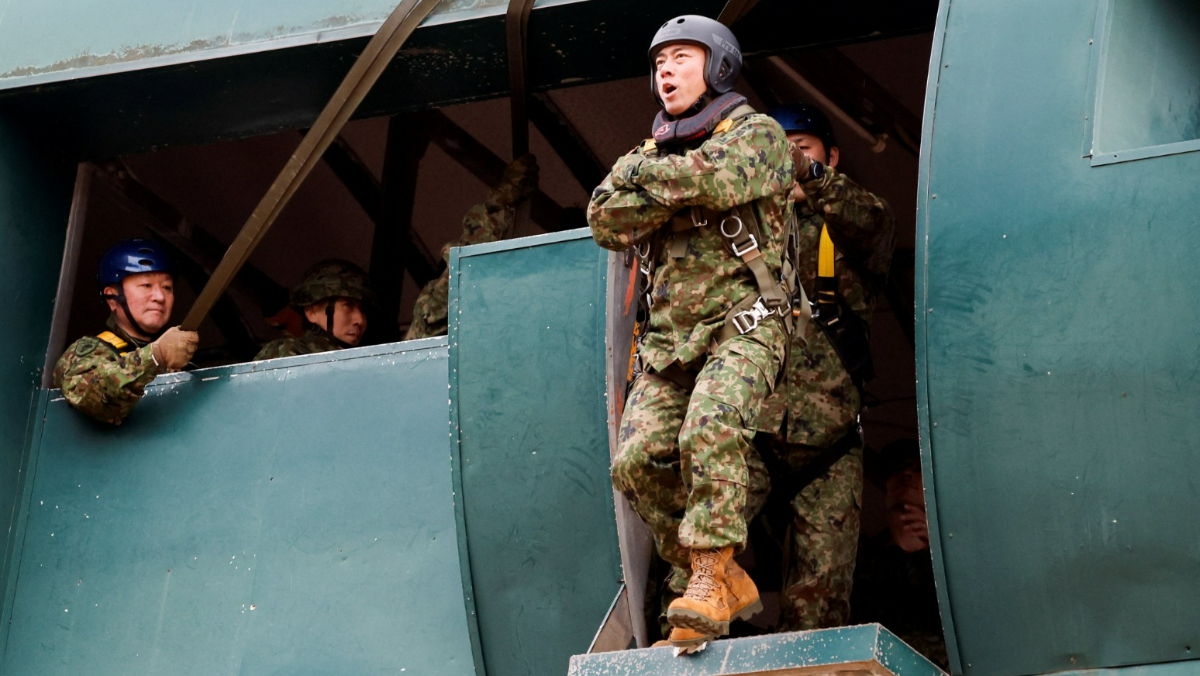 日本防衛大臣小泉進次郎昨天(1/11)在千葉縣陸上自衛隊「習志野演習場」,視察了設想「島嶼防衛」的陸自第一空降團(日本稱第一空挺團)新年首場空降訓練,原定空降訓練因強風取消,小泉全副武裝體驗了傘降基本動作。