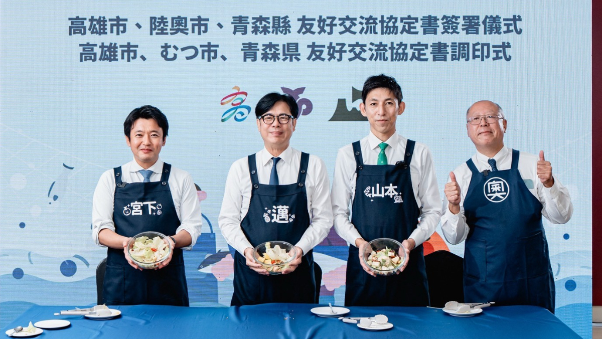 日本青森縣與陸奧市訪問團10月18日至21日訪高雄,20日與市府簽署三方友好交流協定,高雄再添2姐妹市,迎來第44及45個締盟城市。簽署後三市首長以鳳梨、烏魚子、蘋果、鮭魚等在地食材進行創意沙拉PK,象徵文化融合。