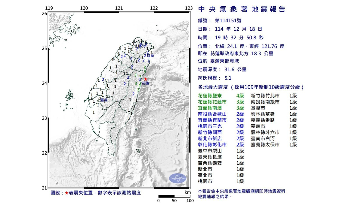 中央氣象署公告,今(12/18)日晚間7時32分,台灣東部海域發生芮氏規模5.1有感地震,地震深度31.6公里,屬於淺層地震;震央位於花蓮縣政府東北方18.3公里處,位在台灣東部海域,北部明顯感受到搖晃。