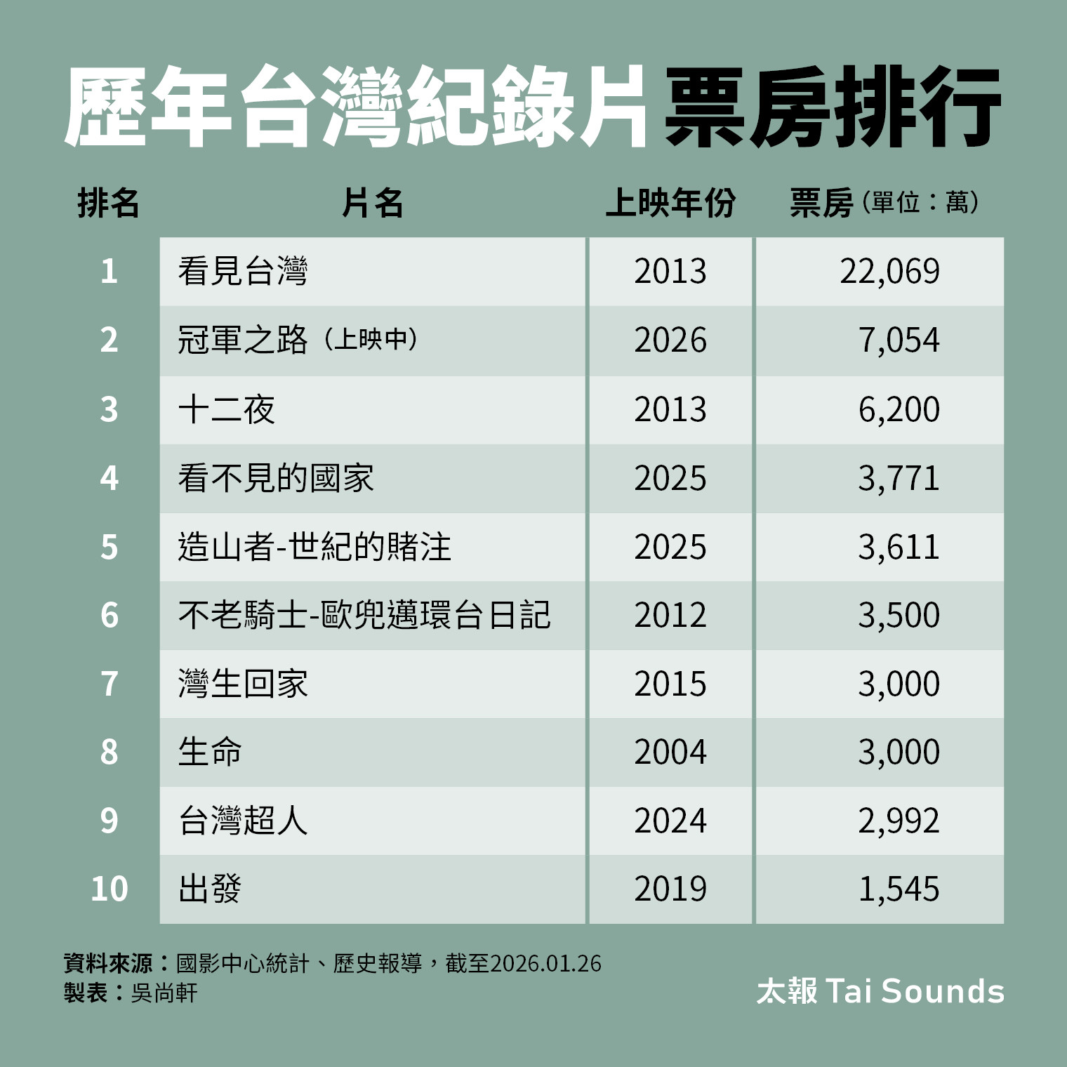 《冠軍之路》上映近一個月票房突破7000萬元,擠下《十二夜》成為本土紀錄片亞軍。攤開排行榜,2024-2026年就有4部紀錄片擠進前10名,看在業界人士眼裡,從過去2000年代國片低谷時,靠著《生命》、《無米樂》等作品突破重圍,再到2010年代《看見台灣》、《十二夜》激發輿論更牽動國家政策,乃至如今《冠軍之路》、《造山者》的佳績,台灣觀眾渴望看到自己土地的故事,同時也有越來越多創作者,願意以商業角度構築作品。