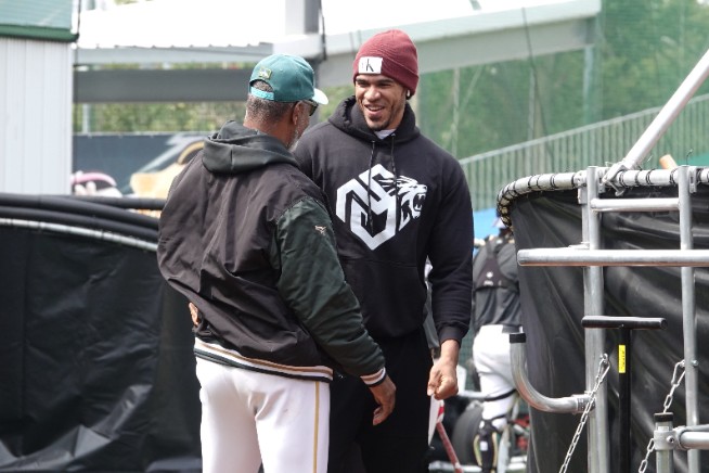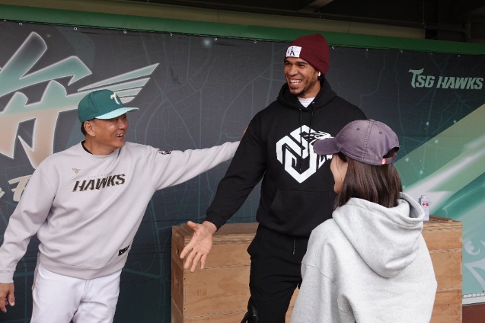 看到許久未見的隊友、球員,魔鷹熱情送上擁抱,與總教練洪一中、打擊教練路易士(Luis Santos)關心近況,隊友曾子祐更直接跳到魔鷹身上,顯示出2人的好交情。