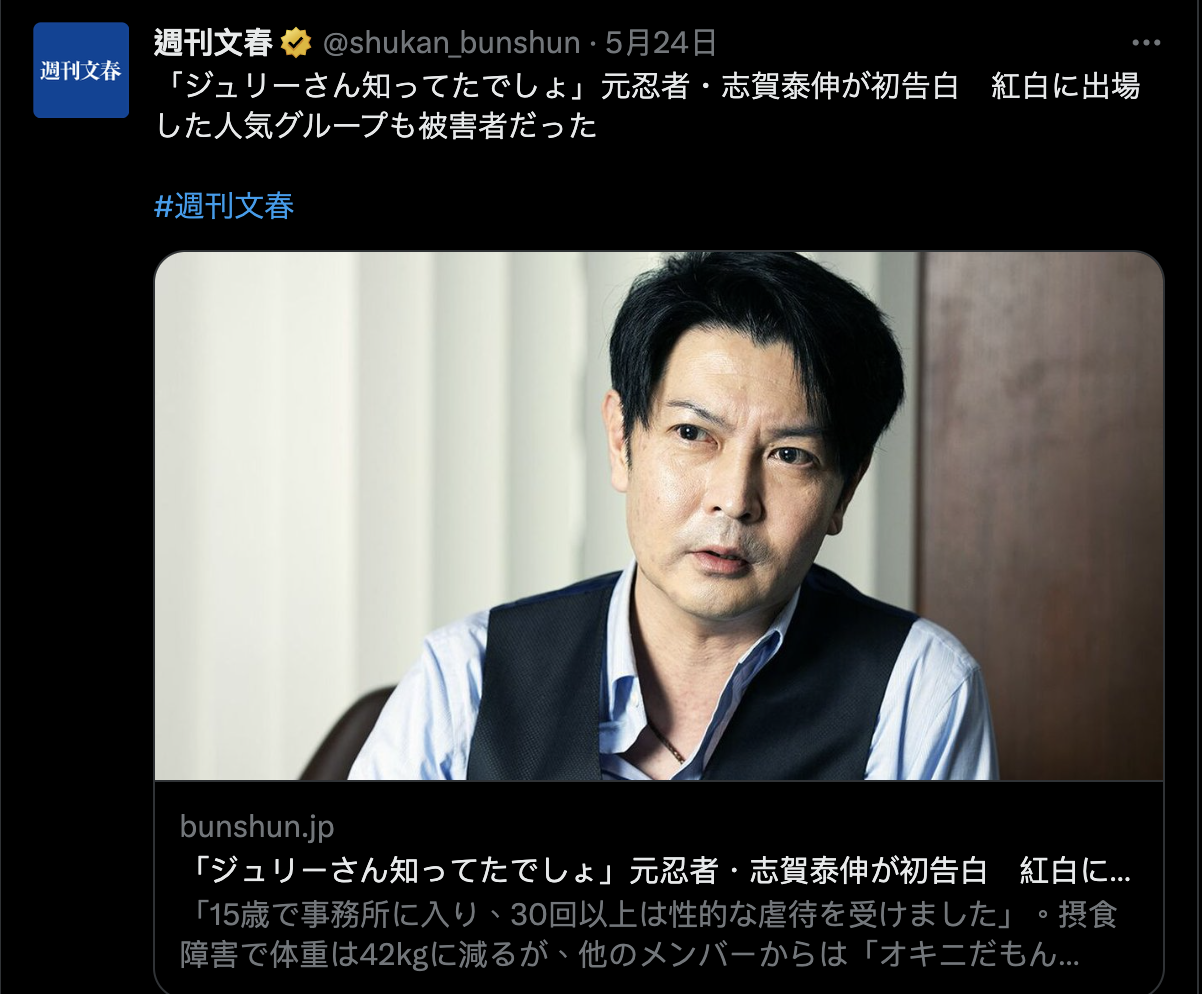 傑尼斯男團藝人志賀泰伸控訴遭創辦人強尼喜多川性侵。翻攝推特