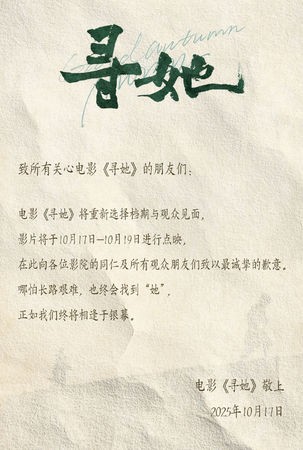 舒淇近期除了Netflix影集《回魂計》與自編自導電影《女孩》即將上映外,《尋她》也是頗受關注的新片之一,不料在昨日上映後約3個小時,卻遭到火速下架,撤檔前票房累積17.3萬人民幣(約台幣74萬元)。對此製片公司也發聲明表示,影片將重新選擇檔期與觀眾見面,並於10月17日至19日進行全國點映。同時向影院同仁及觀眾表達誠摯歉意,強調「即使長路艱難,也終會找到『她』,正如大家終將相逢於銀幕。」