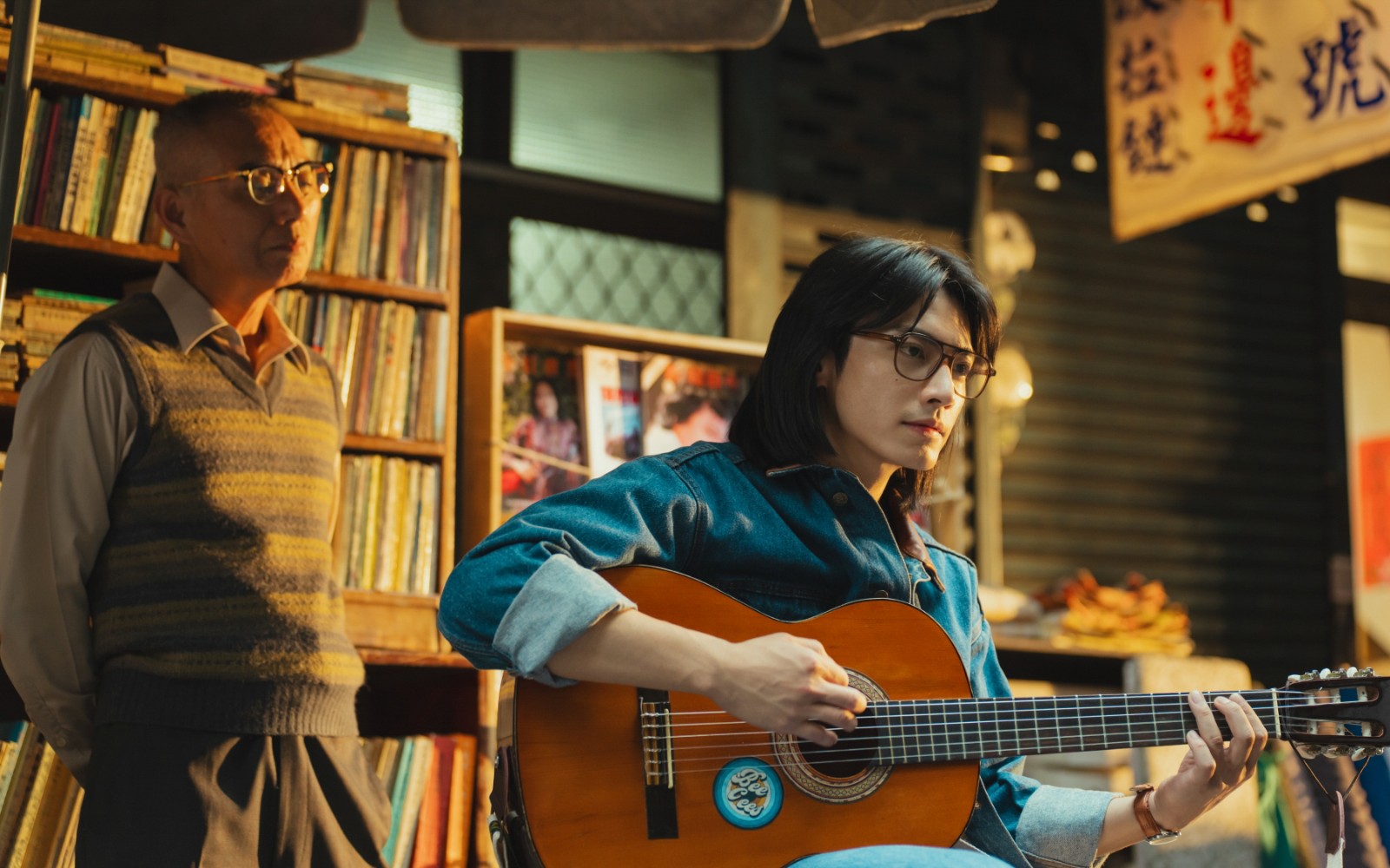 宋柏緯(右)在《那張照片裡的我們》中飾演熱愛音樂的青年,靠著聽1977年歌單和眼鏡入戲。瀚草文創GrX STUDIO提供