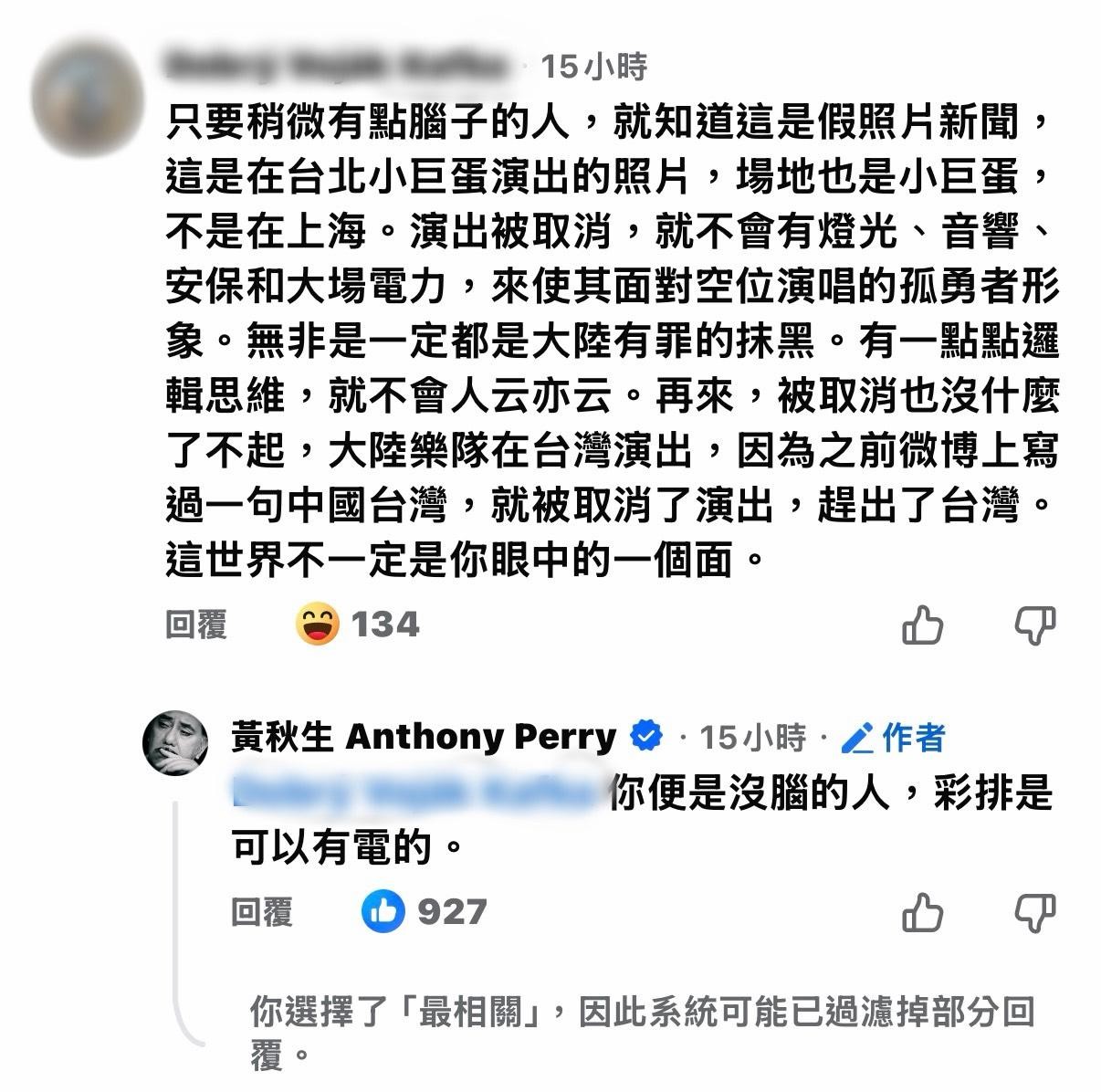 不過也有人留言質疑「無人演唱會」真實性,認為這些都是假新聞,認為如果真的被取消演出,現場就不會有燈光、音響、安保和大場電力,引來黃秋生在底下留言直嗆「你便是沒腦的人,彩排是可以有電的。」
