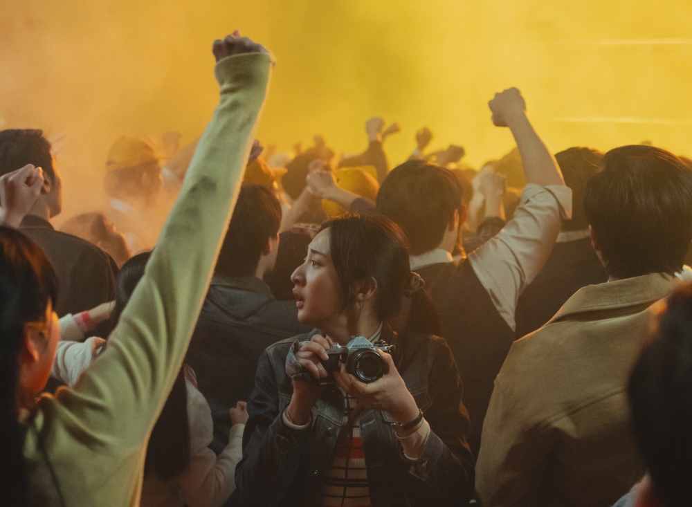 《那張照片裡的我們》出動300名臨演打造逼真抗議場面,李沐(中)飾演的賢英在人群中記錄下一切。瀚草文創GrX STUDIO提供