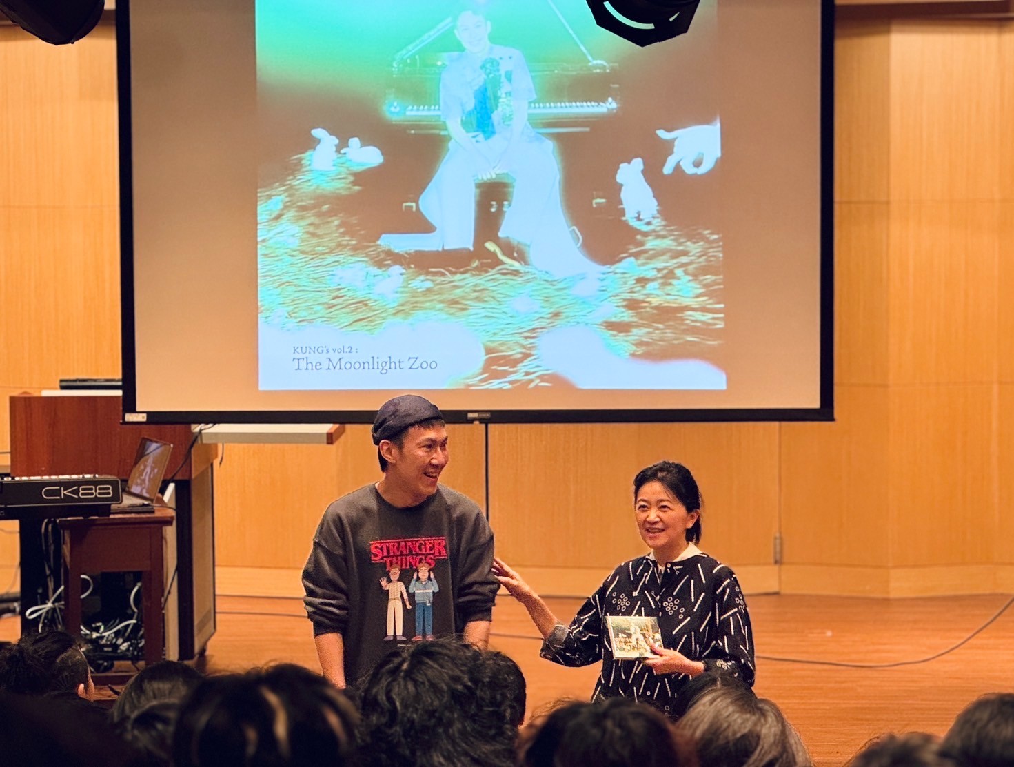 阿龔(左)受李欣芸老師之邀到台藝大擔任特別講師。緒風有限公司提供