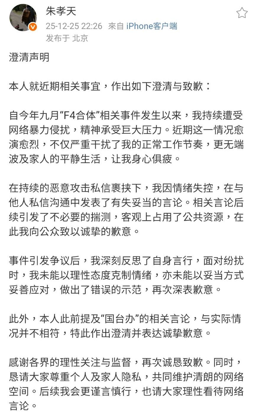 朱孝天自9月「F4」合體巡演破局後一連串暴走,他解釋:「我持續遭受網路暴力侵擾,精神承受巨大壓力。近期這一情況愈演愈烈,不僅嚴重干擾了我的正常工作節奏,更無端波及家人的平靜生活,讓我身心俱疲。在持續的惡意攻擊私信裡挾下,我因情緒失控,在與他人私信溝通中發表了有失妥當的言論。相關言論後續引發了不必要的揣測,客觀上佔用了公共資源,在此我向公眾致以誠摯的歉意。」