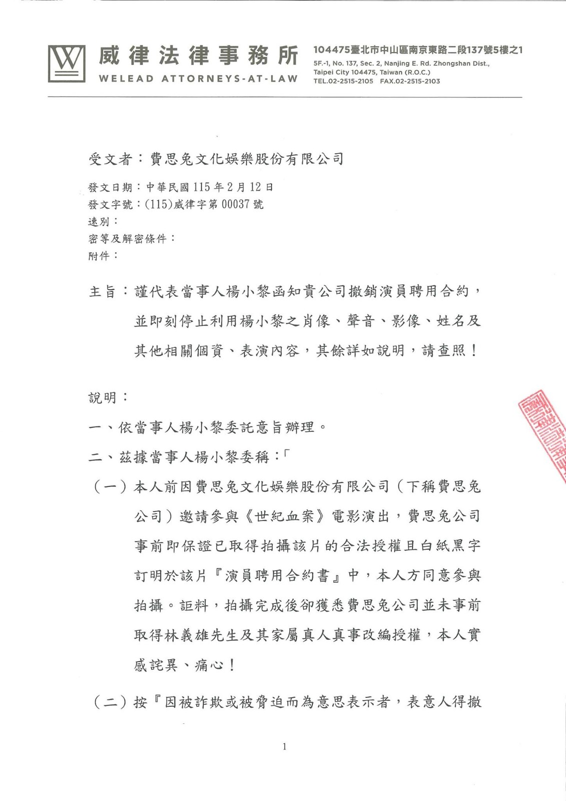 最後,楊小黎認為:「費思兔公司既未依照保證條款事先取得合法授權,已違約在先且無從補正,本人亦得終止合約,並請求賠償此事件所造成之一切損害。」主張撤銷「演員聘用合約書」,並警告製作方:「不得再利用本人之肖像、聲音、影像、姓名及其他相關個資、表演內容,亦不得作為電影上映、發行之用。」