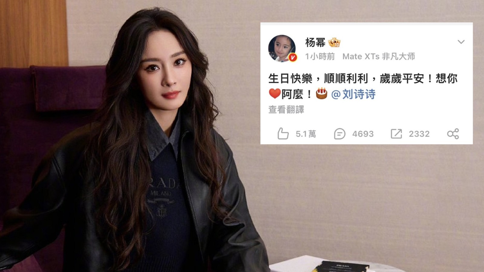 陸劇頂流女星楊冪10日的貼文是祝福好友劉詩詩生日快樂。取自微博