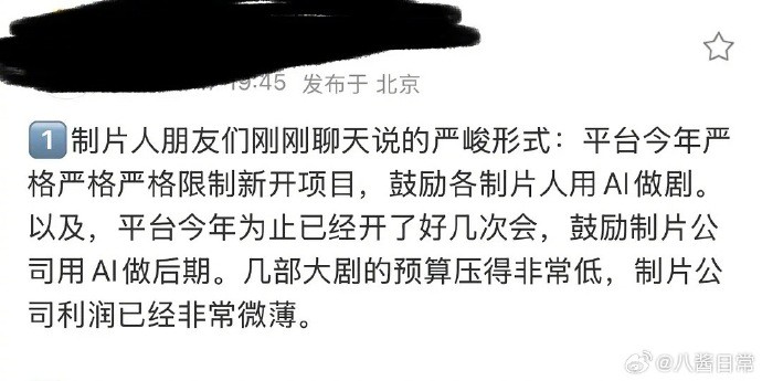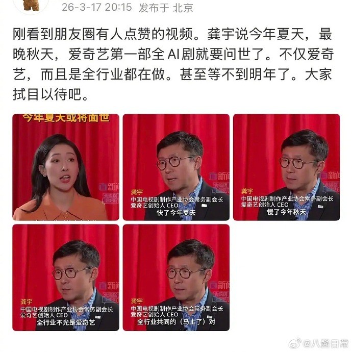 陸網近期流傳「男二以下角色將由AI全面取代」的說法,加上平臺壓縮製作預算、裁員及鼓勵AI製作等傳聞,市場焦慮升溫;不過多數網友對此持保留態度,認為真人表演仍具不可取代性,也質疑AI製作未必能有效降低成本,甚至可能增加技術投入與專業人力需求。