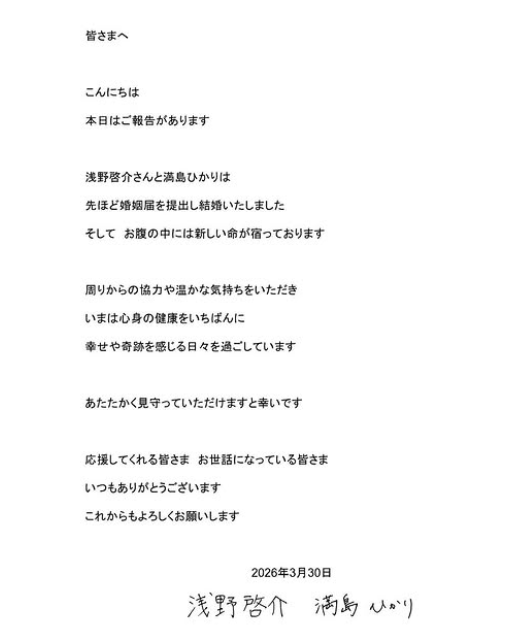滿島光以及淺野啓介以連名方式公告喜訊,表示稍早已完成婚姻登記,正式成為夫妻,並進一步透露「肚子裡已經孕育著新的生命」,同步公開迎來新生命的喜訊。消息曝光後,不少粉絲在社群留言祝福。