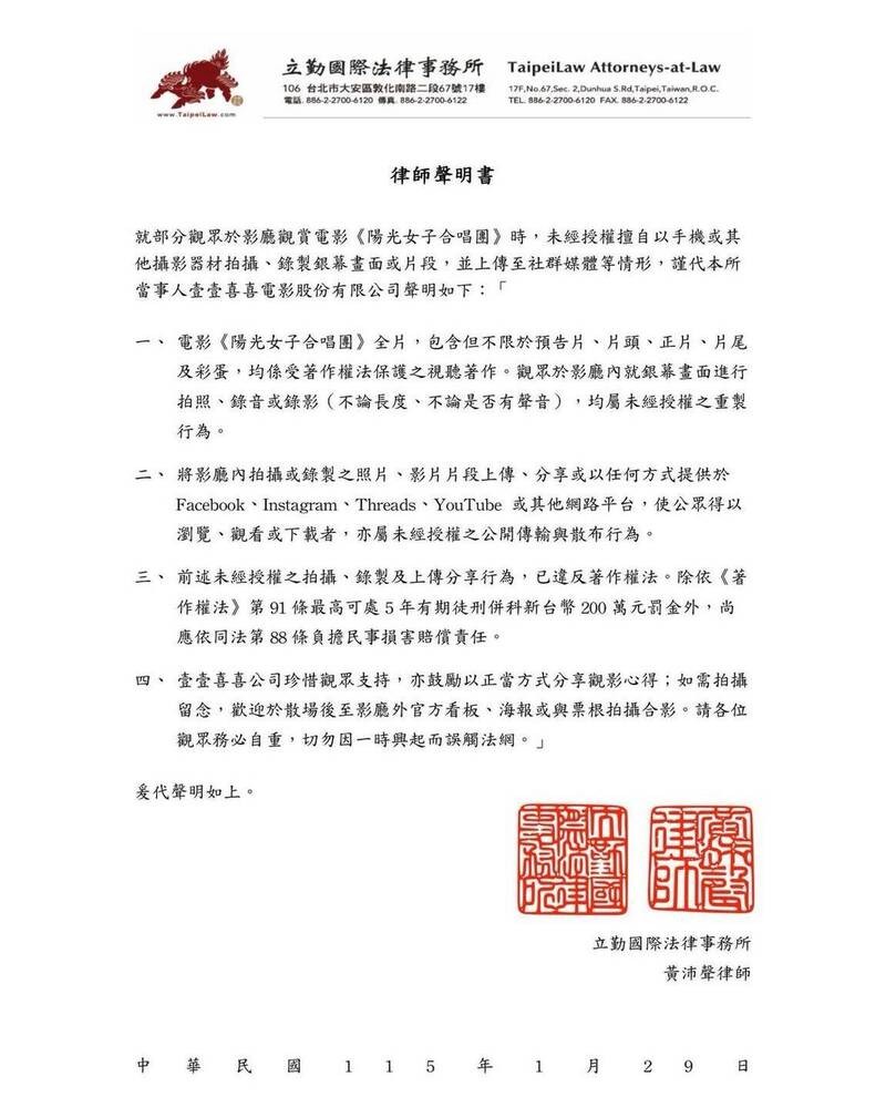 劇組當初對台灣網友發出律師聲明書,如今卻對澳門網友行為靜悄悄。翻攝自陽光女子合唱團臉書