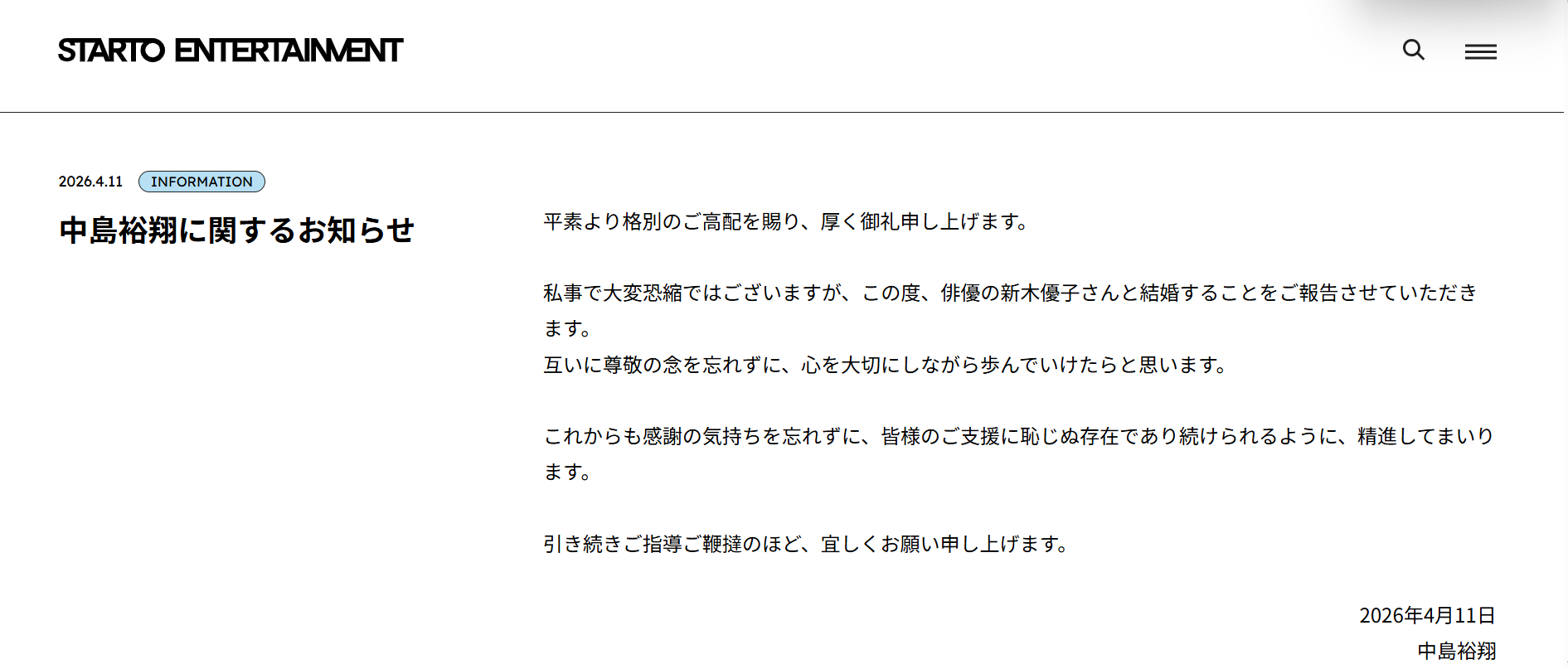 今年32的中島裕翔在官網發表聲明表示,「這是非常私人的事情,實在不好意思,不過我想向大家報告,我與演員新木優子小姐結婚了」,他也提到對婚姻生活的心情,「希望我們能不忘彼此的尊重,珍惜彼此的心,一起走下去」。在中島裕翔發表婚訊聲明後,隨後新木優子也在官方網站同步報喜,感性回顧自己10歲出道至今的點滴,並承諾婚後會以更謙卑的姿態,在演藝道路上持續努力。