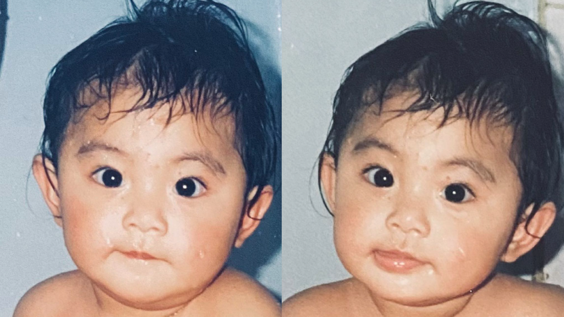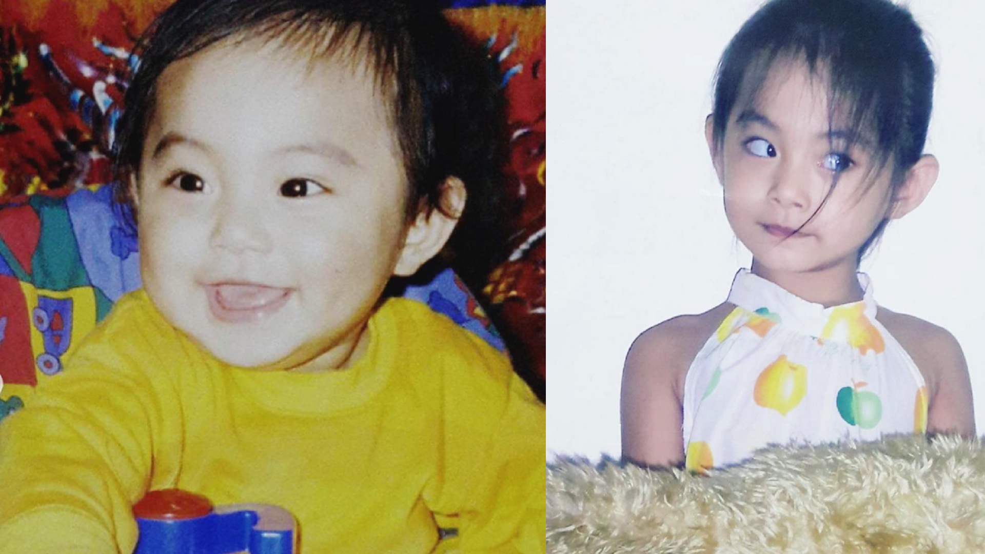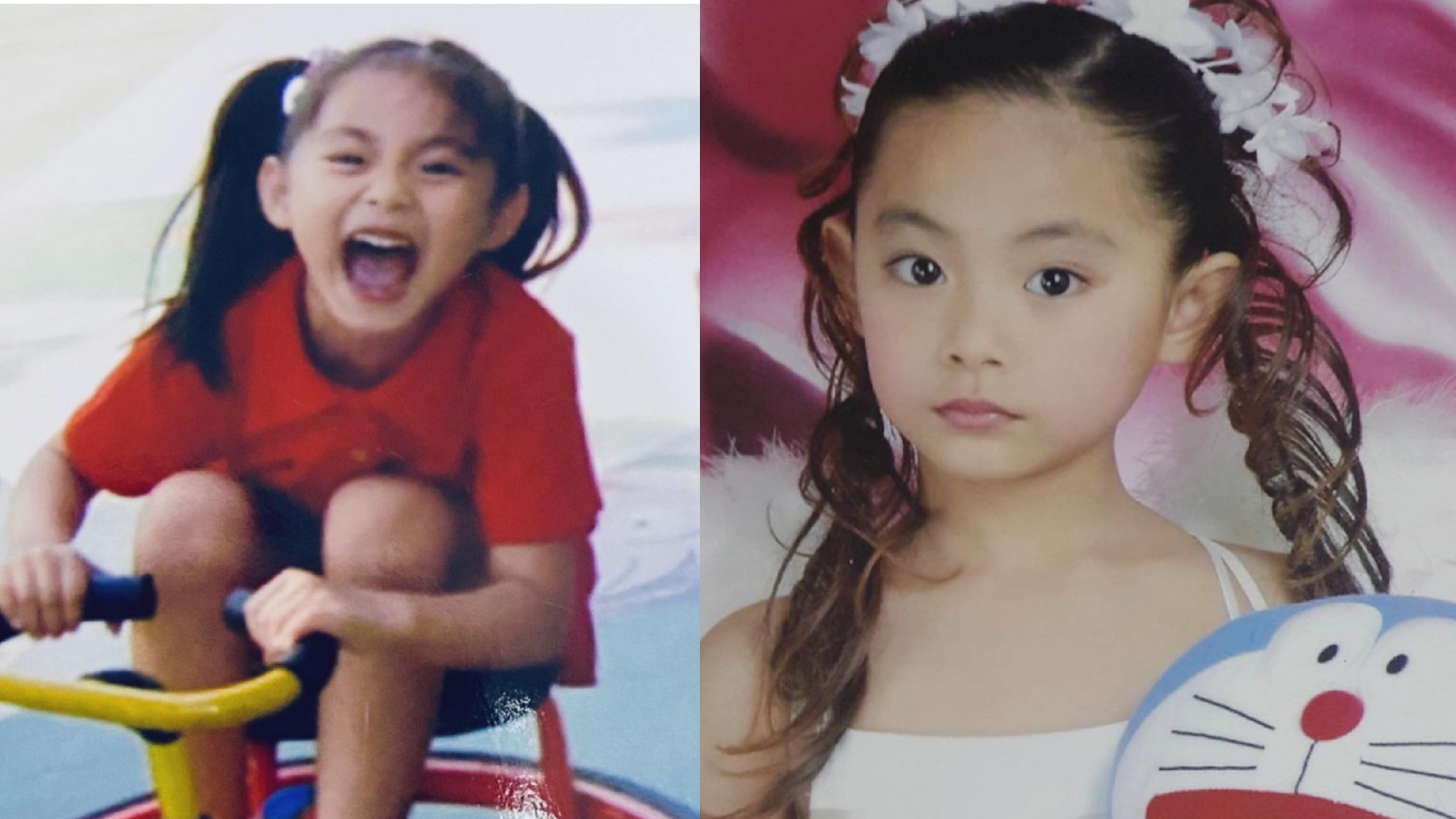 系列童年照首張照片就是洗澡照,沒穿衣服、瞪著一雙大眼睛看著鏡頭。接著,長大些,圓滾滾的眼睛以及盼鬼臉的搞笑照,跟現在的精緻美貌一模一樣。
