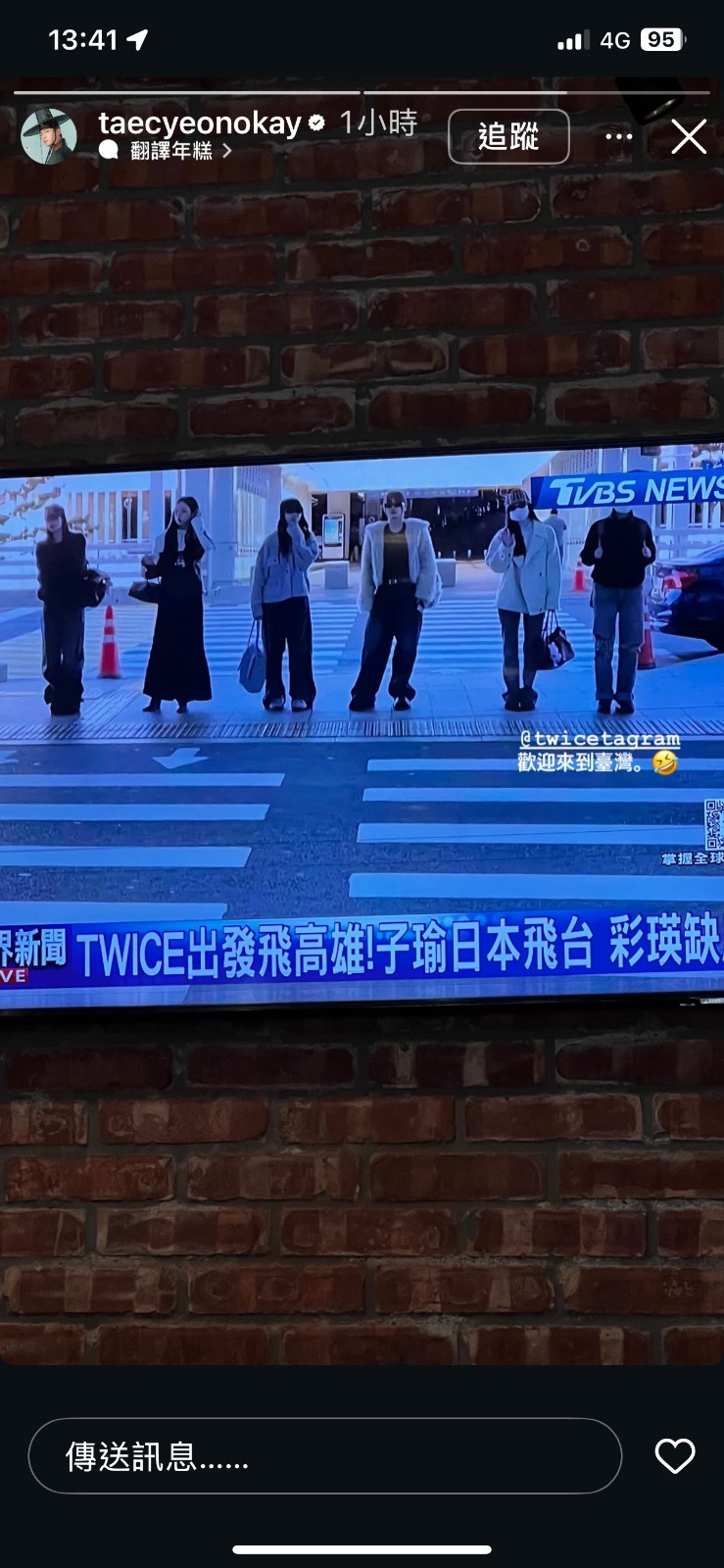 韓星玉澤演近期在台中拍新戲之餘,天天在台中市區到處趴趴走,被粉絲笑稱「半個台中人」。他今(11/21)日透過IG限時動態分享台灣電視新聞報導TWICE抵台的畫面,還特別標記TWICE官方帳號並用繁體中文寫下:「歡迎來到臺灣」立刻在網路掀起熱議,笑翻網友。