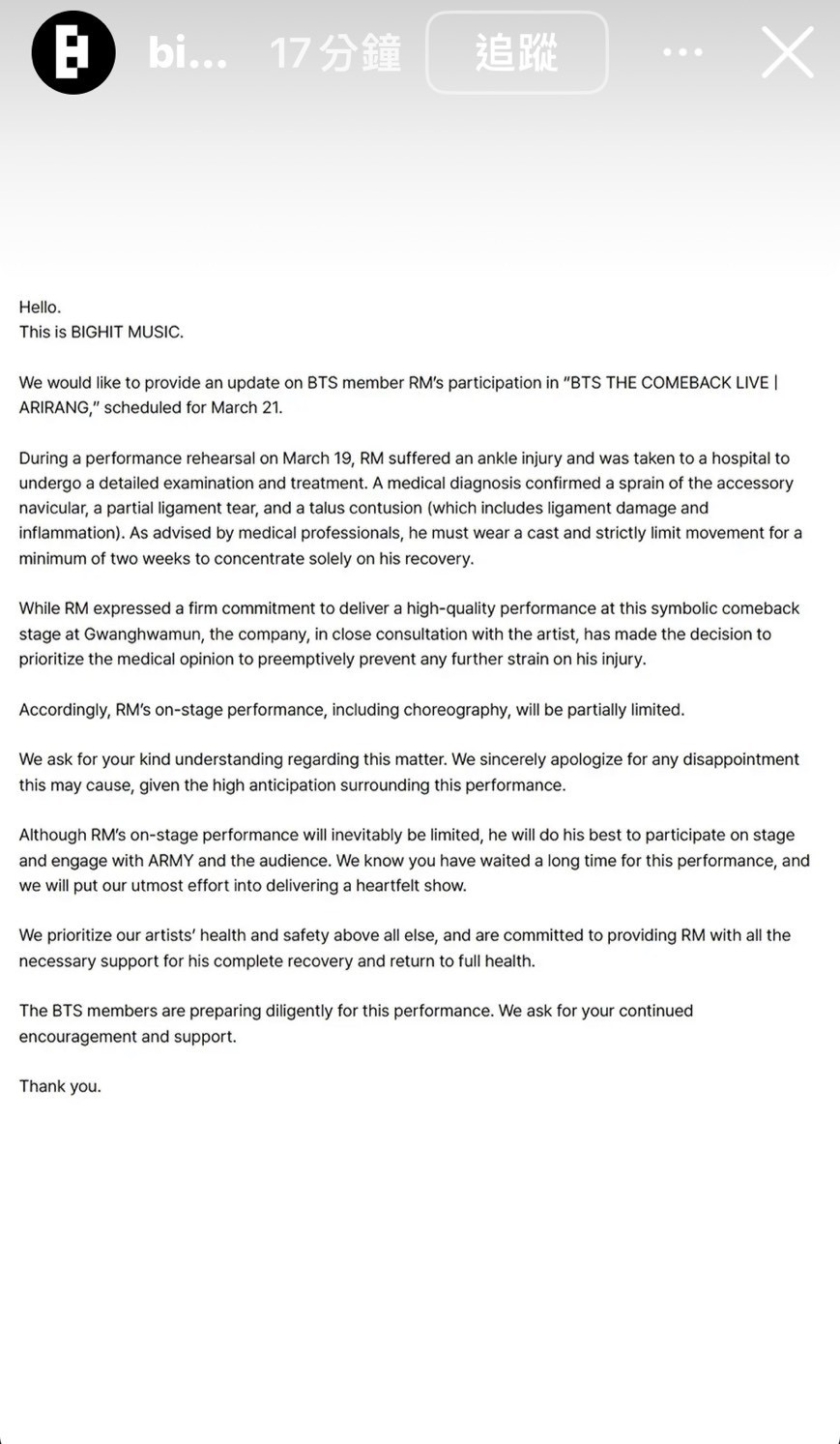 面對回歸演出在即,RM本人仍強烈希望能以最佳狀態登台,但經公司與藝人充分討論後,決定以醫療專業意見為優先,避免傷勢進一步惡化。因此,RM雖確定仍會參與21日的光化門演唱會,但舞台上的編舞與部分高強度表演將有所限制。