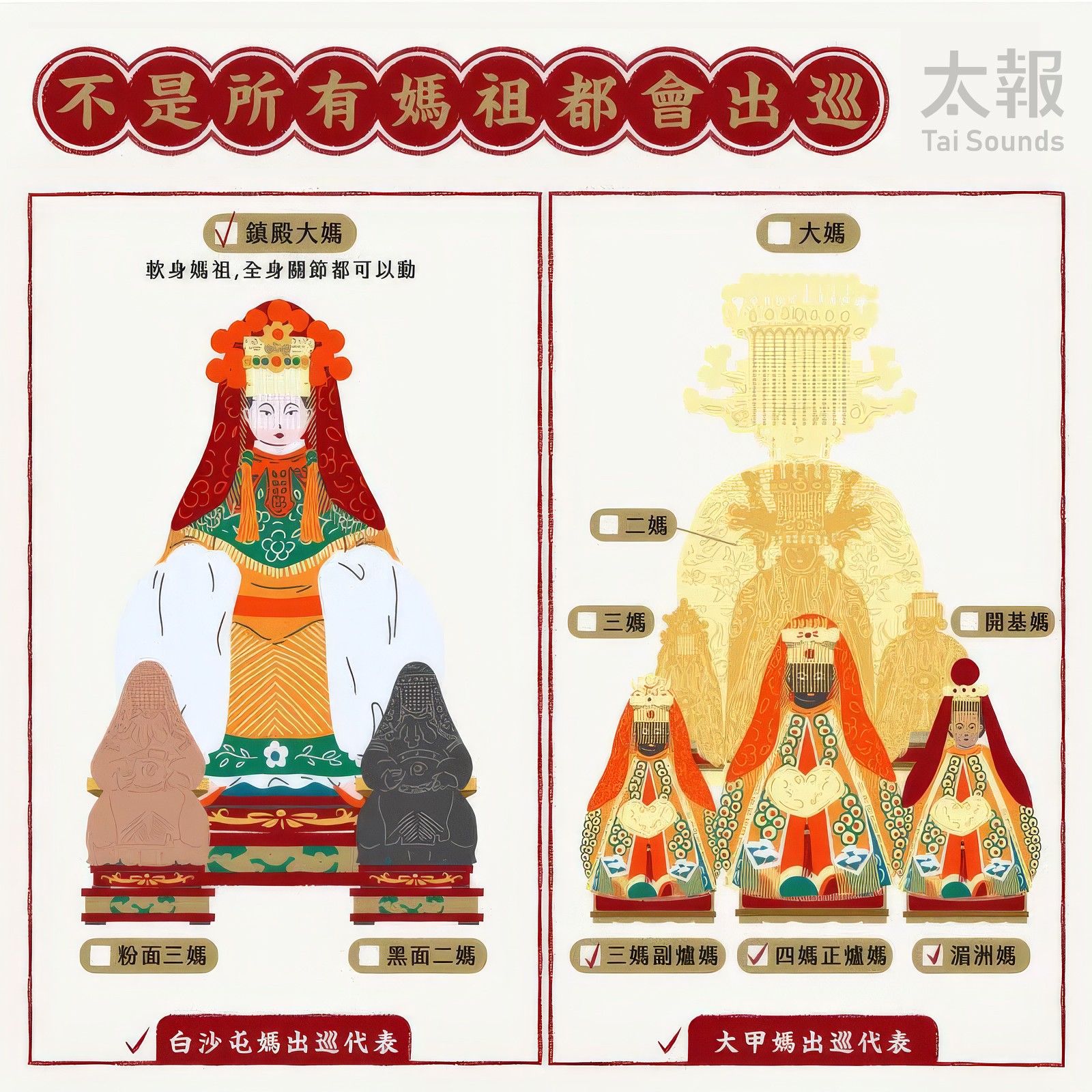 不過,或許許多人心中會有疑惑,「咦?到底白沙屯媽祖和大甲媽祖有何不同呢?」《太報》就用5張圖卡向大家介紹,來進行「超級比一比」!