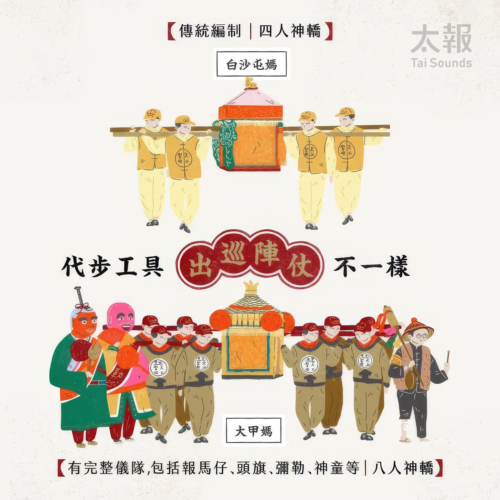 白沙屯媽祖與大甲媽祖的出巡陣仗、代步工具不一樣。太報繪製