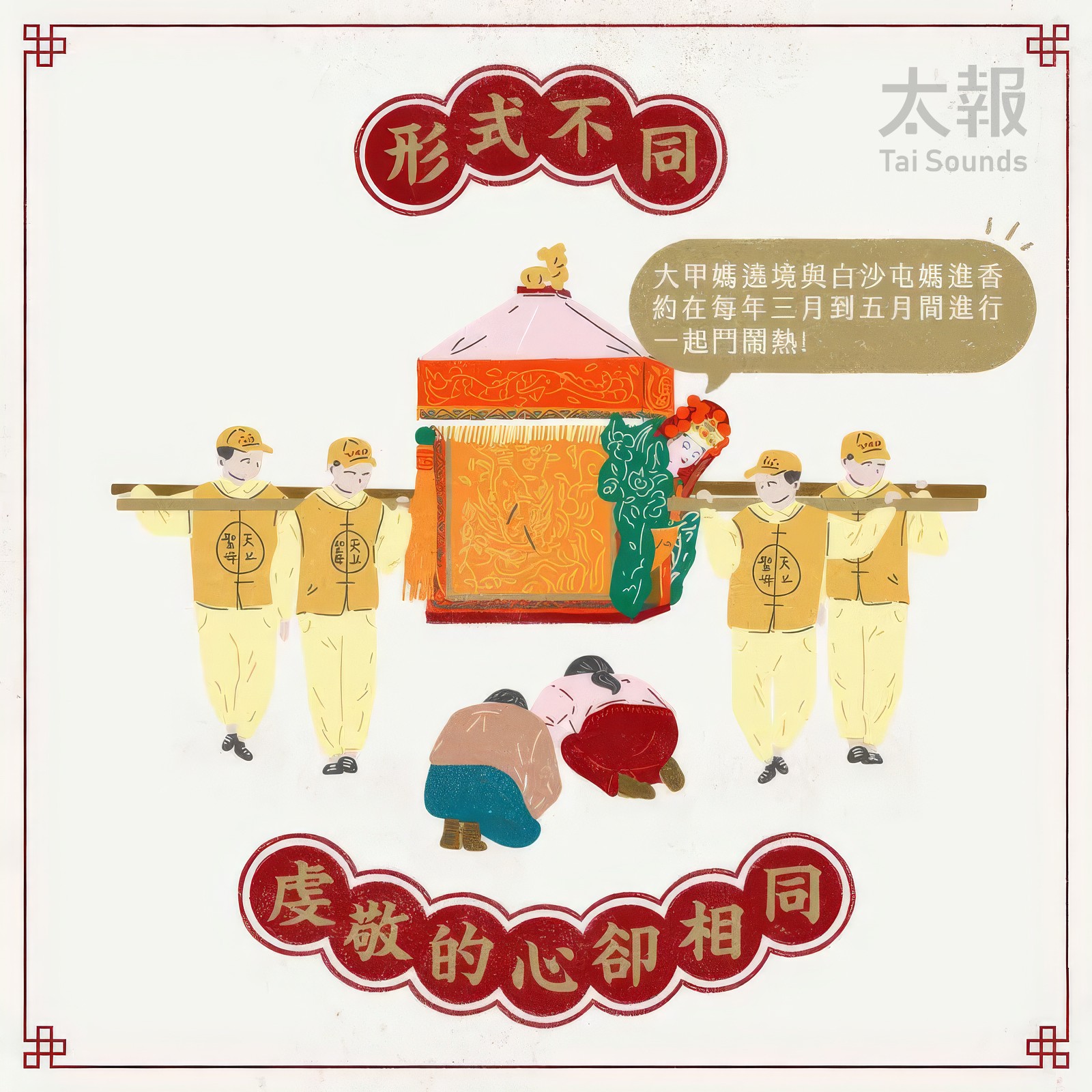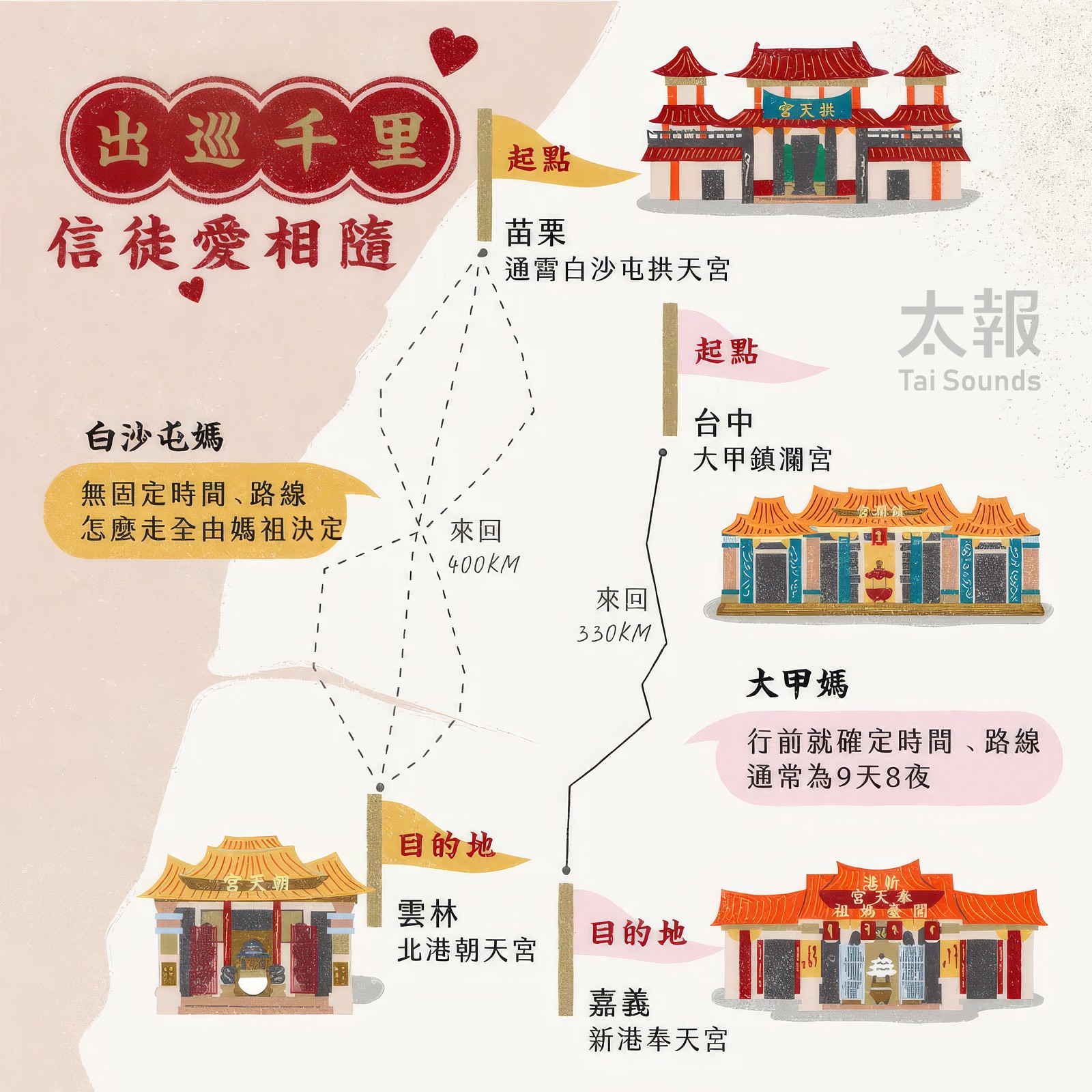 白沙屯媽、大甲媽形式不同,心意相同。太報繪製
