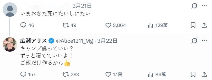 雖然這名網友沒有直接回應,但看到廣瀨愛麗絲留言的網友們都大受感動,鼓勵原PO說「哇好羨慕,請繼續生活,開懷大笑吧」、「沒關係。你醒了。光是這一點就很了不起。好好生活吧。」、「你絕對是個很棒的人!即使感覺快要死了,你每天早上還能起床,這太了不起了。你做得非常出色!」、「我也想被邀去露營」。