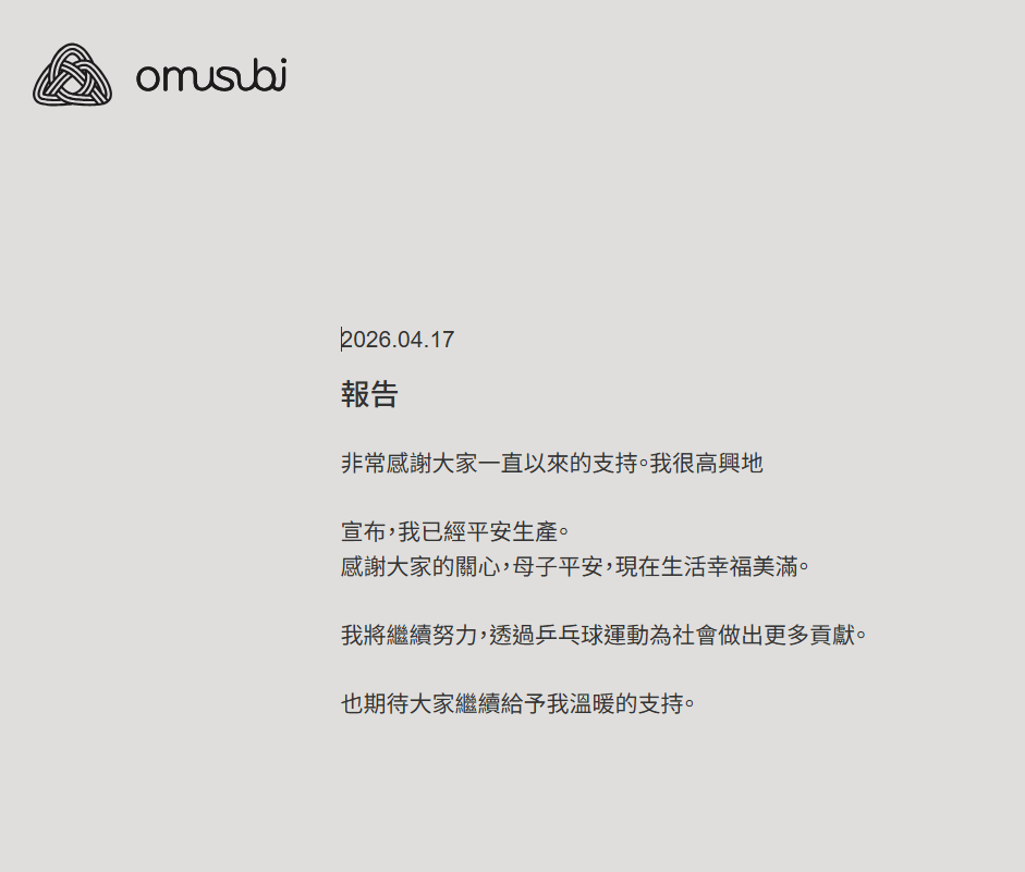 福原愛與橫濱男的寶寶日前平安誕生。翻攝自omusubi 官網
