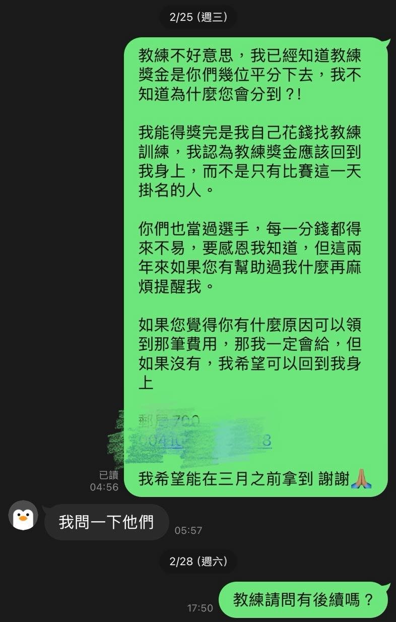 邱聖芯難過地說,10萬元不是特別多,「但足以讓一位什麼都靠自己的自由選手在這備戰的兩年中拿出來感謝教練與替自己增添補給品和裝備,當我冒著各種風險在路上訓練、拼命比賽拿下金牌時,而有些人,不曾為我執教甚至沒有任何交集就把我的教練獎金給均分了,看到這裡你們覺得合理嗎?」