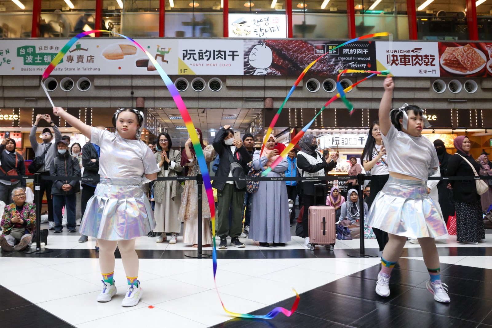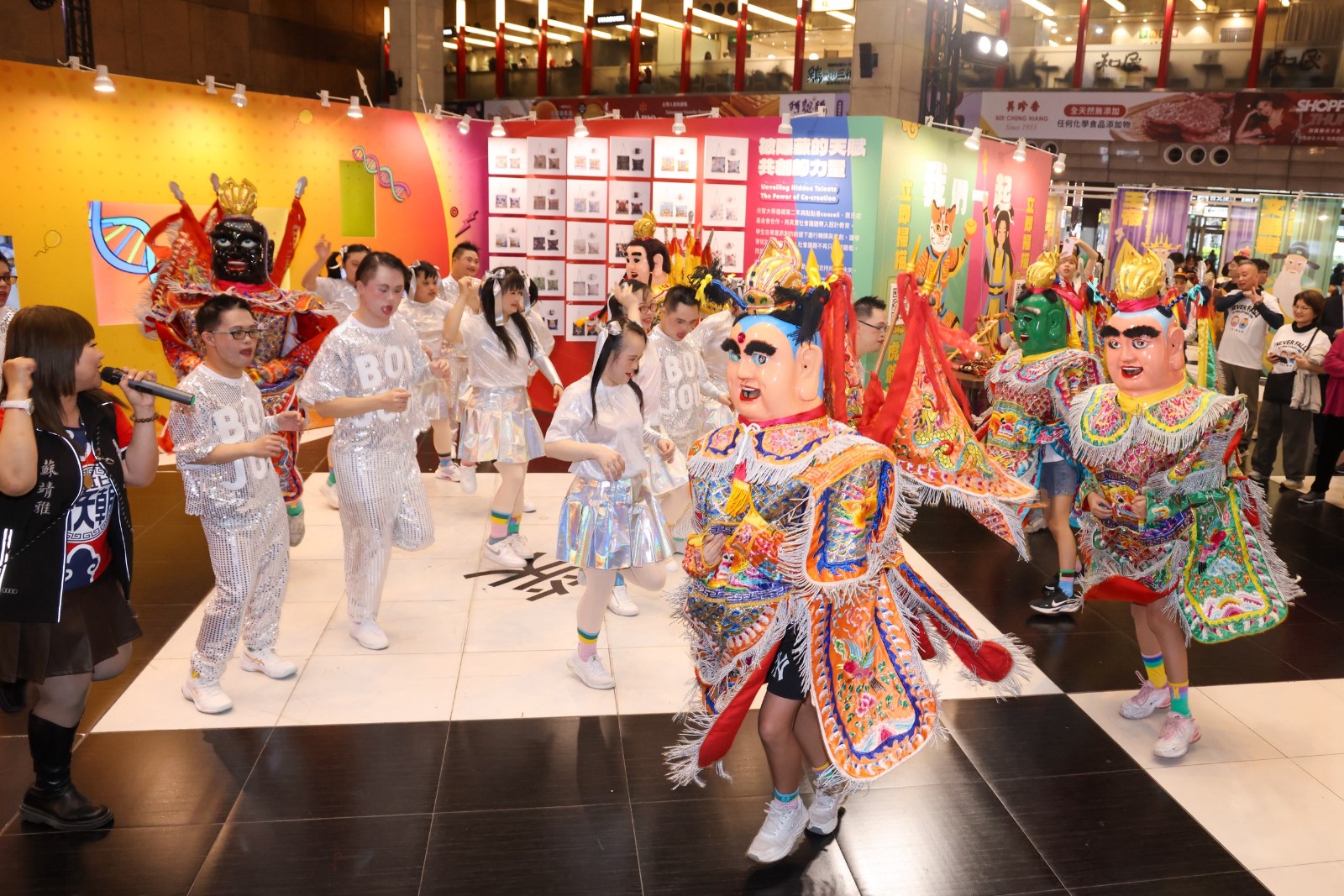 唐氏症基金會於台北車站大廳舉辦「321 因為有你,我們一起」特展開幕活動,將台灣「廟口夜市文化」搬進城市樞紐,並邀請北港朝天宮媽祖駐轄現場,期盼將3月打造為一個充滿理解與溫度的「台灣共融月」,唐寶與家將共舞。廖瑞祥攝