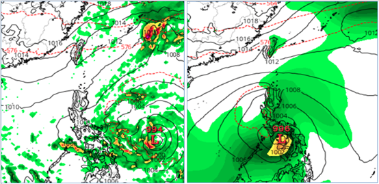 最新(29日20時)歐洲模式(ECMWF)及其AI模式,下週三(5日)20時模擬顯示,西北太平洋仍有熱帶系統發展。歐洲模式模擬在菲律賓東方海面(左圖),AI模式則模擬在菲律賓中部(右圖)。翻攝自氣象應用推廣基金會