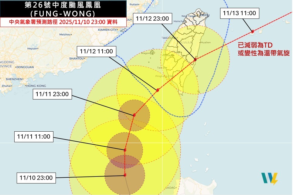 鳳凰颱風登陸點南修,且有加速趨勢。翻攝天氣職人吳聖宇臉書